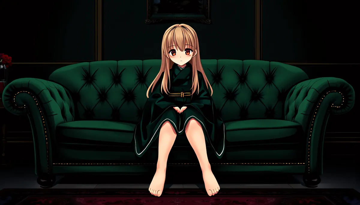Anime girl wearing a dark-green dress, sitting on a big green sofa, in a dark room.