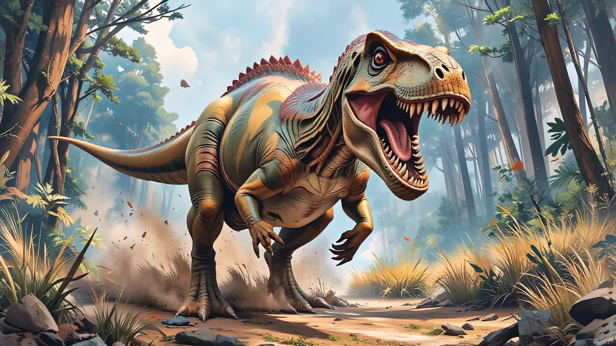 Camo colored dinosaur roaring in the forest.