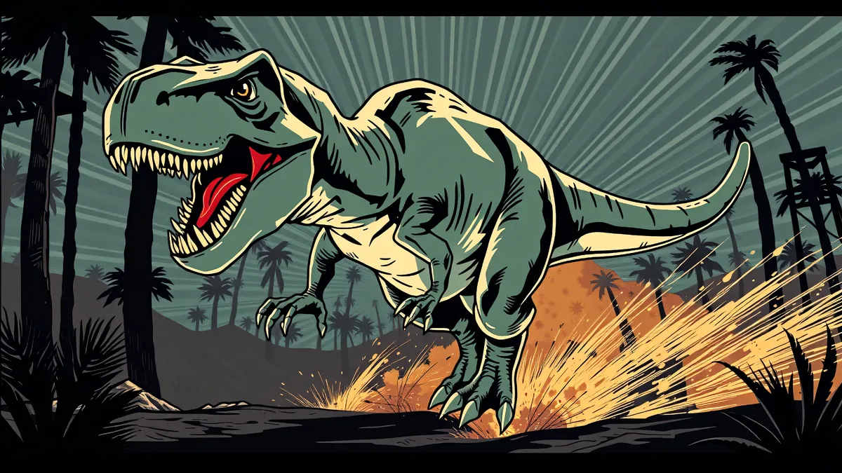 A cartoon of a dinosaur running and roaring, in a tropical setting.