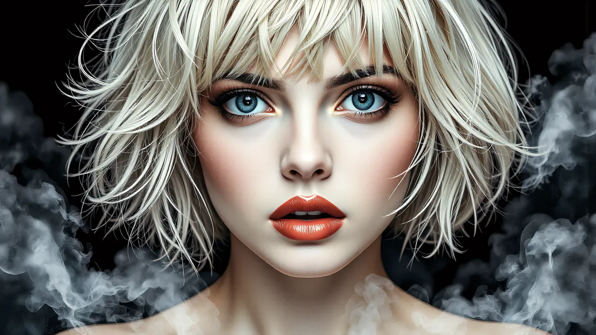 Close-up of the face of a blonde female, standing in front of a smoky background.