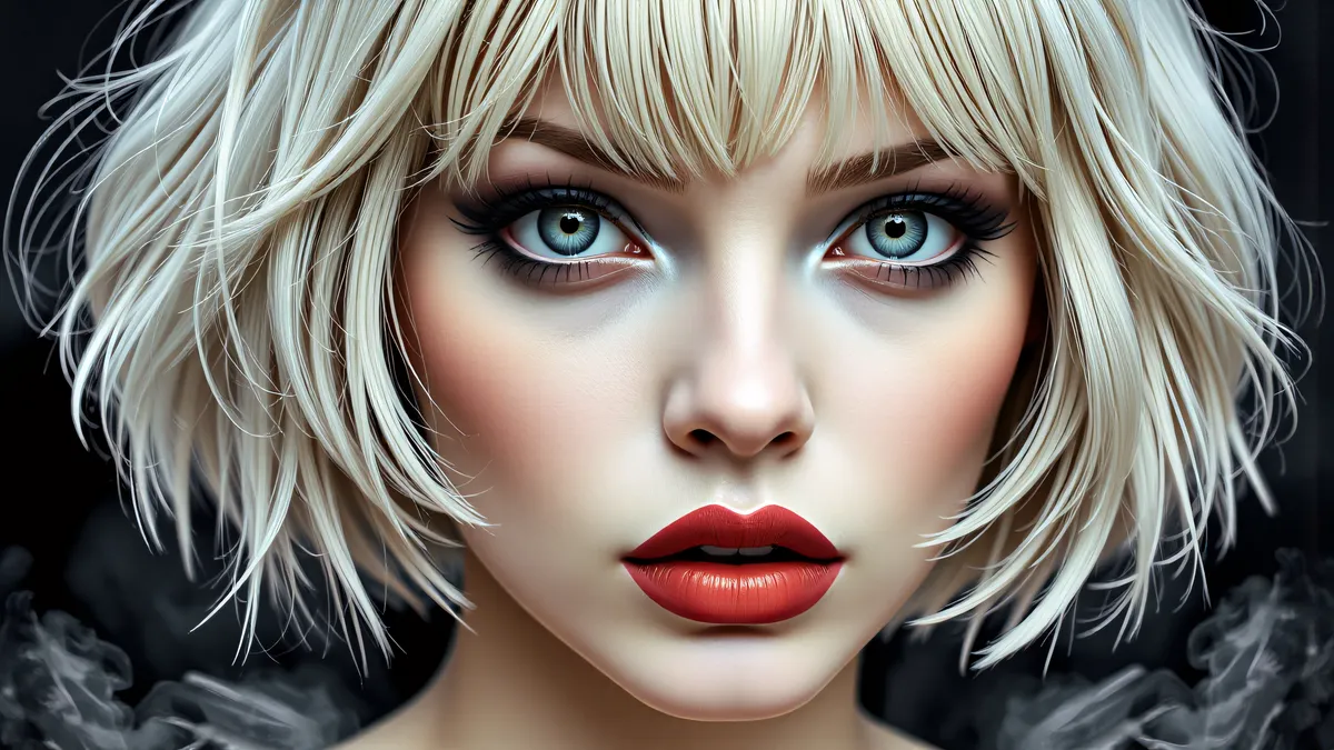 An extreme close-up on a blonde female face, in front of a smoky background.