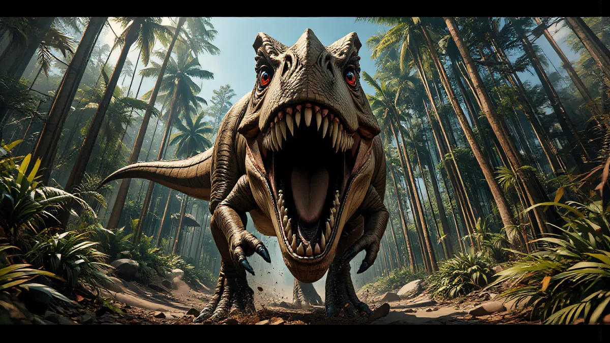 A dinosaur standing in the middle of a dirt road, roaring, surrounded by a tropical setting.