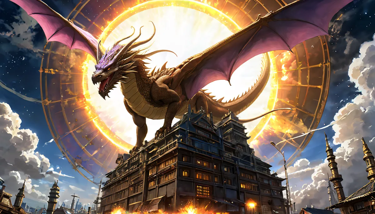 A grandiose dragon standing on top of a castle