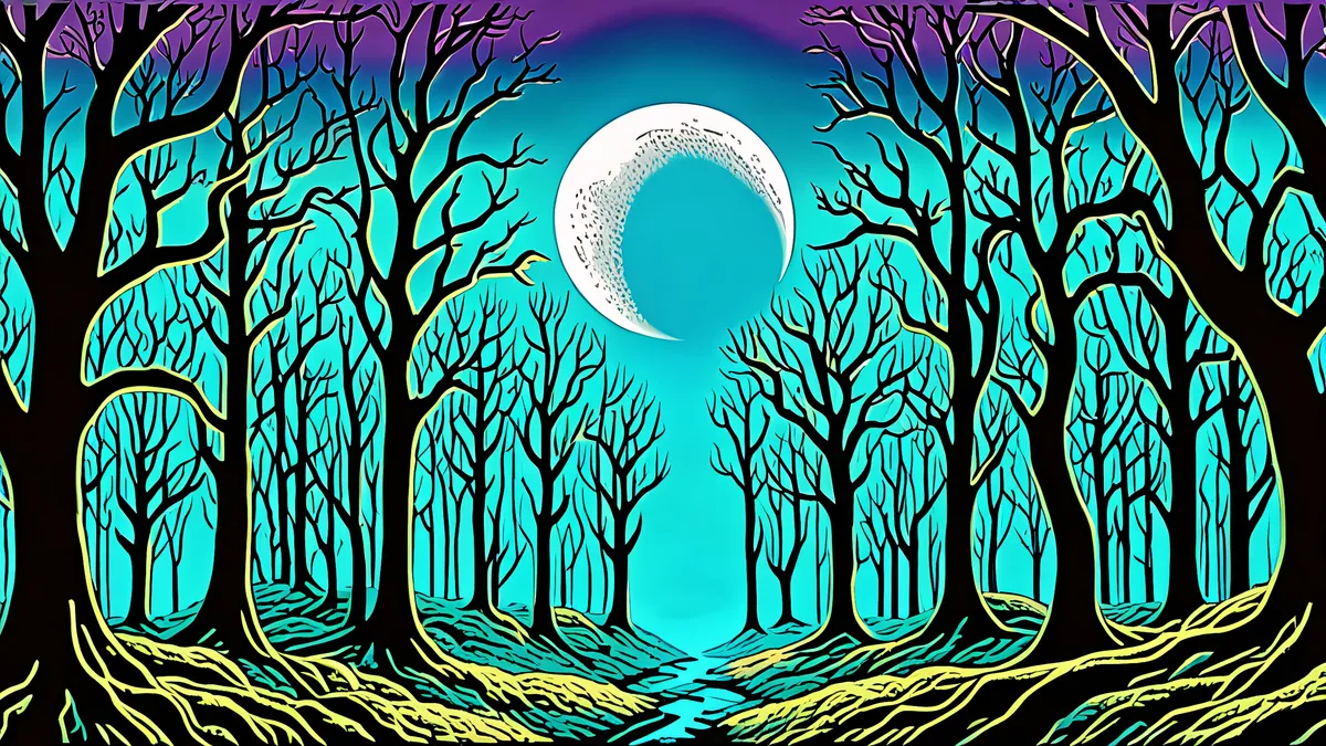 Trees and the moon depicted in a colorful, playful manner
