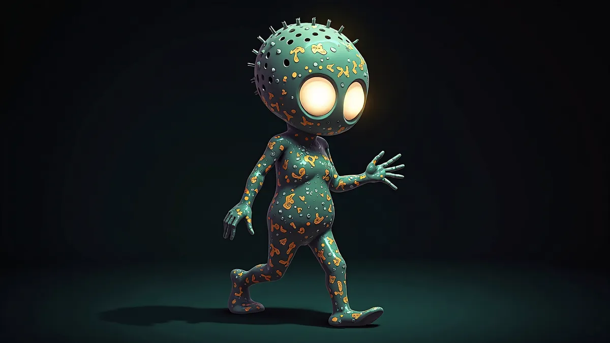 Alien covered with yellow spots, big glowing eyes, walking in front of clear dark background.