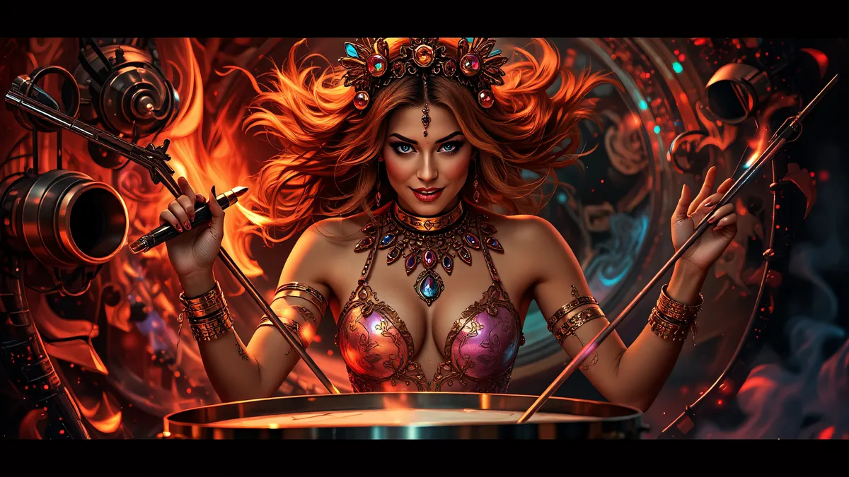 A majestic redhead, dressed in fancy clothes, handling industrial items.
