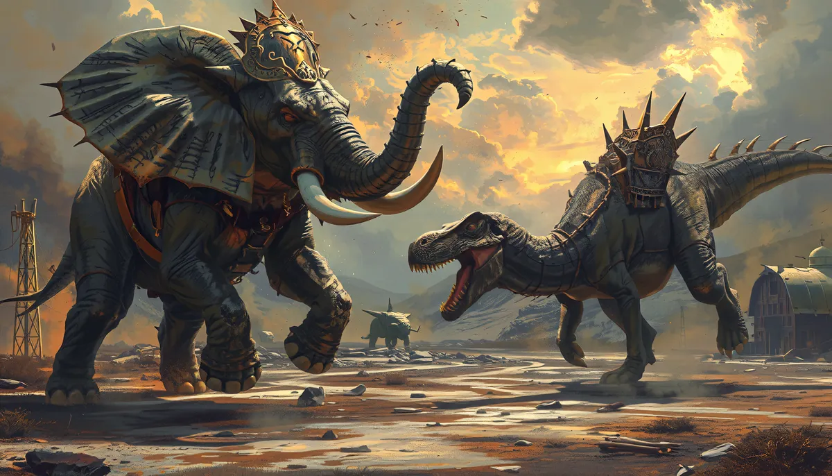 A painting of a dino battling an elephant, with both wearing what appears to be regal attire.
