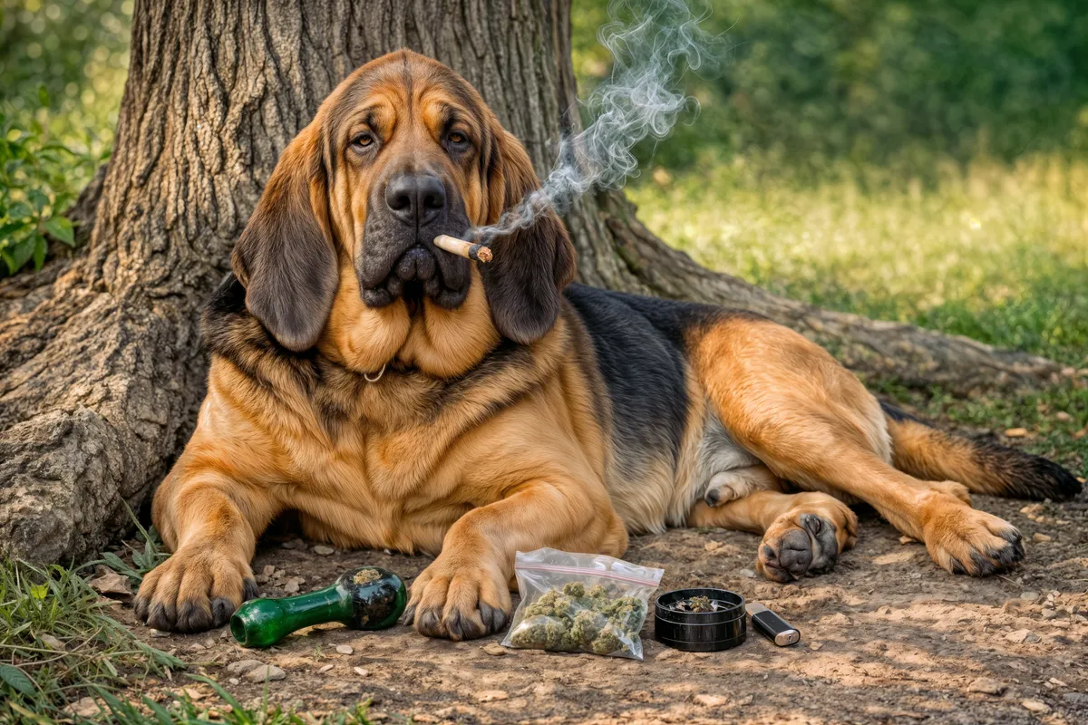 This artwork captures a serene moment of a big, relaxed bloodhound lounging comfortably under the shade of a tree. The gentle expression on the dog's face and the playful twist of smoke wafting in the air create a humorous yet calming scene, celebrating the carefree vibes of nature and leisure.