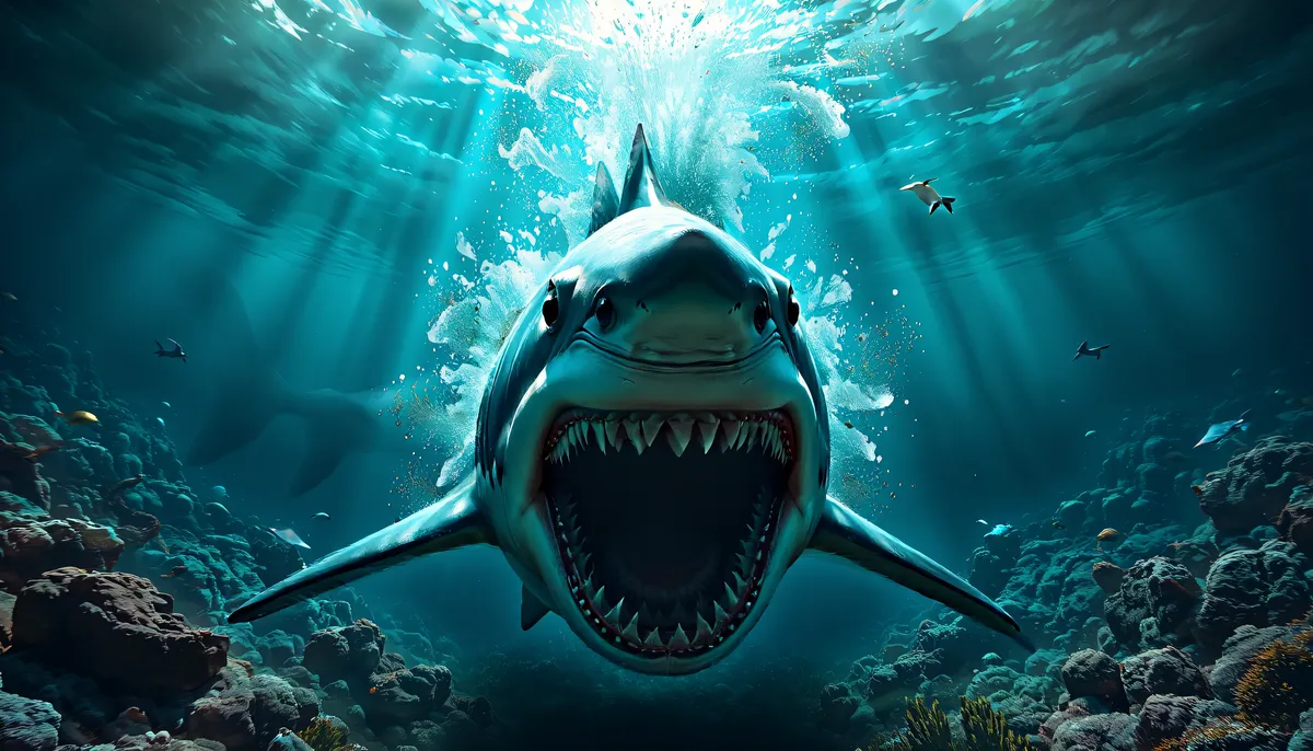 A shark showing off it's might and attacking facing the camera.