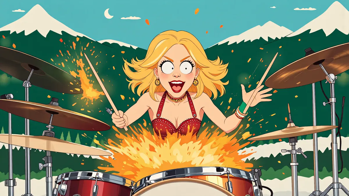 A lady from South Park playing drums enthusiastically.