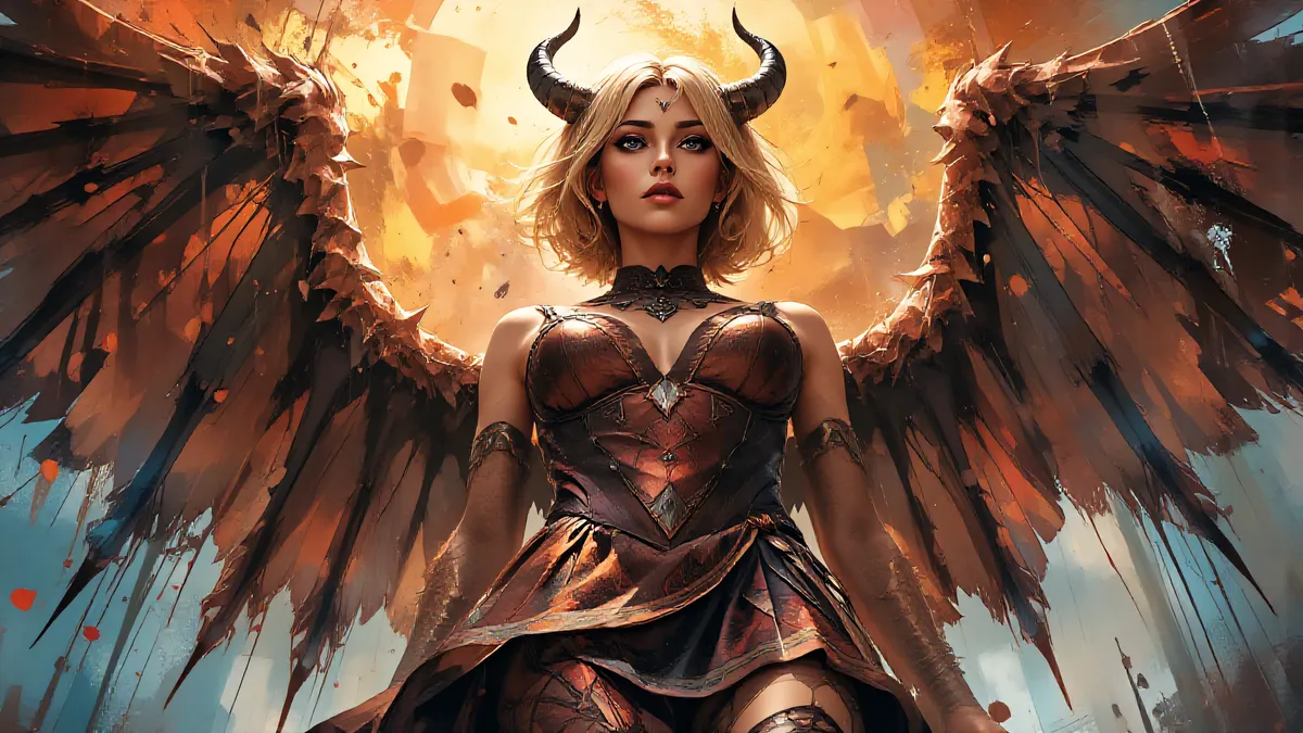 winged and horned succubus standing tall, in front of colorful background.