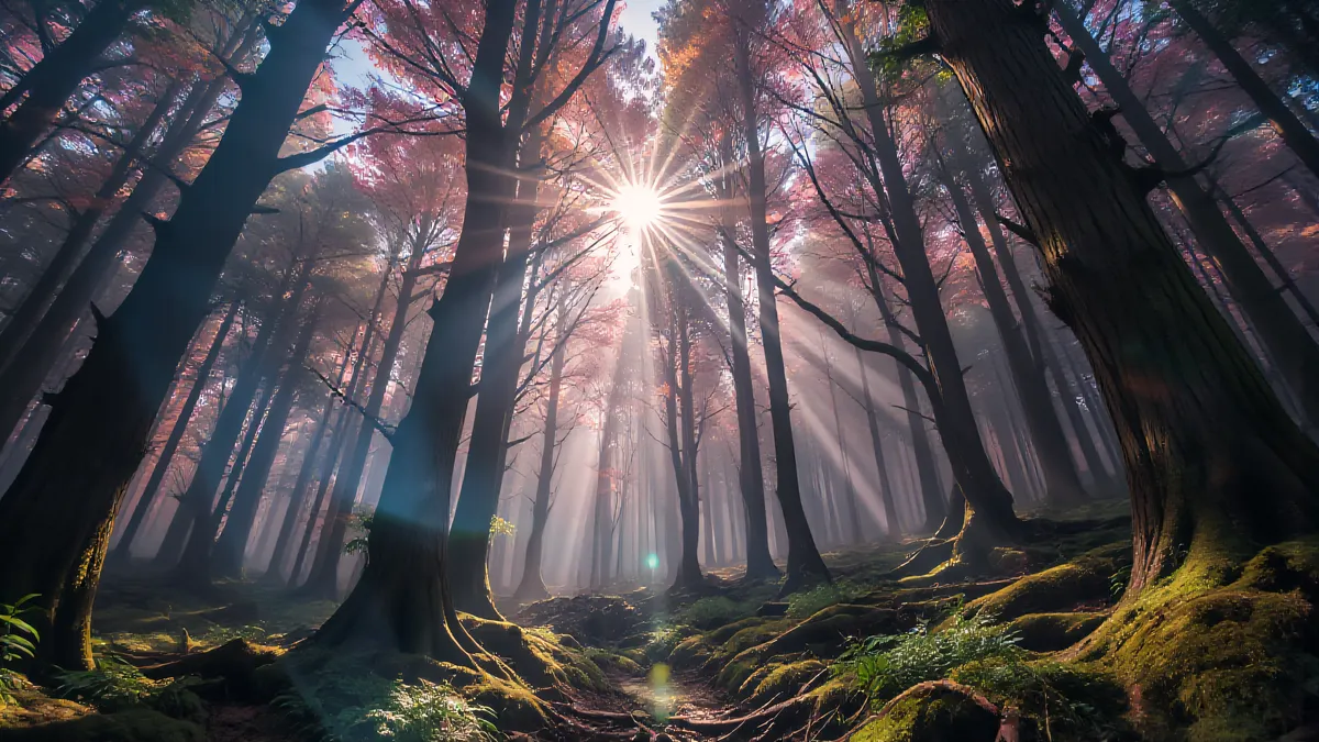 Trees in the woods and sun shining through